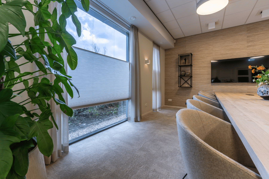 Het groen in stijlvolle potten brengt extra leven en zachtheid in de ruimtes, terwijl de inbetween raambekleding zorgt voor licht, privacy en een rustige uitstraling.